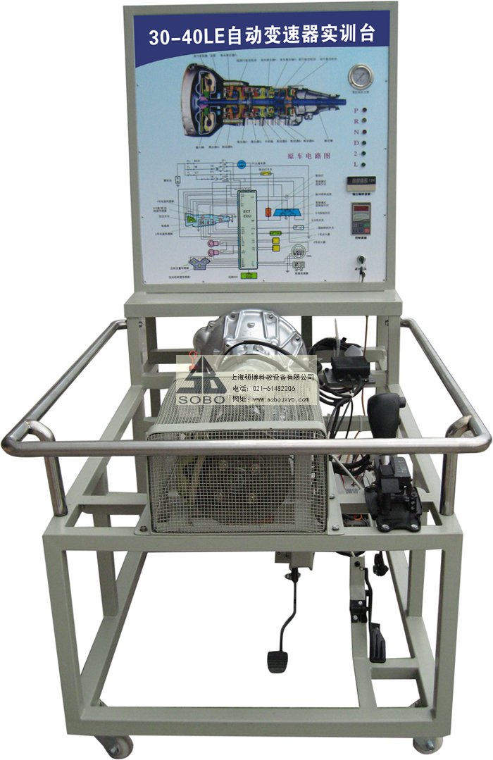 本變速器實訓臺是本公司采用豐田后驅A340E自動變速器為適應汽車教學需求而研制的,該實訓臺由電控變速器(八成新)、操作顯示面板及發動機彩色電氣原理圖電腦控制柜、可移動式臺架(萬向腳輪)、驅動系統(腳踏式油門踏板)變頻電機驅動、啟動系統(電門鎖方式啟動)、車速傳感器、電磁閥執行器、原車電腦、具有發動機運轉及顯示(轉速.車速.檔位)、液壓油壓力顯示表(顯示換檔過程油壓)、自動變速器電磁閥工作指示LED燈、故障設置區可設置12路故障(老師設置任一路線路故障)、故障排除區(學生通過各種儀器、儀表、)在面板上用專用排故線連接排除故障、傳感器信號模擬等多項功能、具結構緊湊、操作方便、安全可靠、教學直觀、是汽車自動變速器實物教學不可缺少的實驗室設備之一。