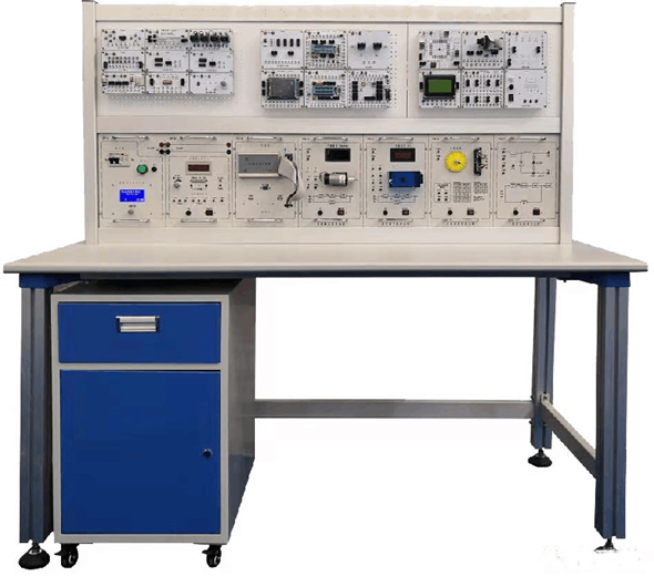 實訓臺主要有實訓桌和實訓臺架組成,實訓桌采用型材結構,桌腿采用4080型材,桌面為防火、防水、耐磨高密度板,結構堅固,造形美觀大方。面板采用鋁板結構,操作面板文字符號用現代彩色噴描技術處理,具有防塵、美觀、耐磨、不掉色等特點。