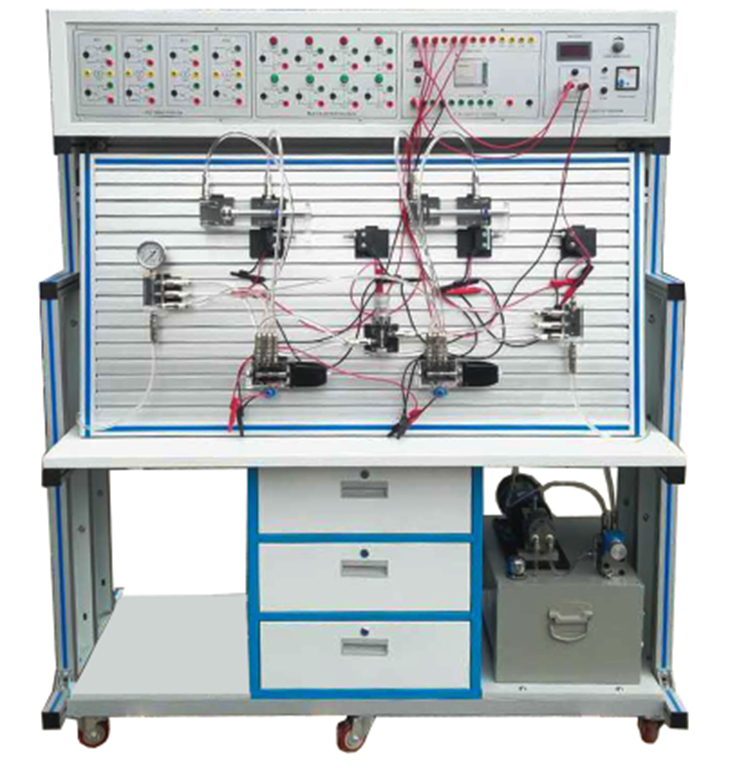 1、液壓PLC控制實驗臺主要由實訓桌、實訓臺、液壓元件和電器控制器件、可編程控制器(PLC)等組件組成。