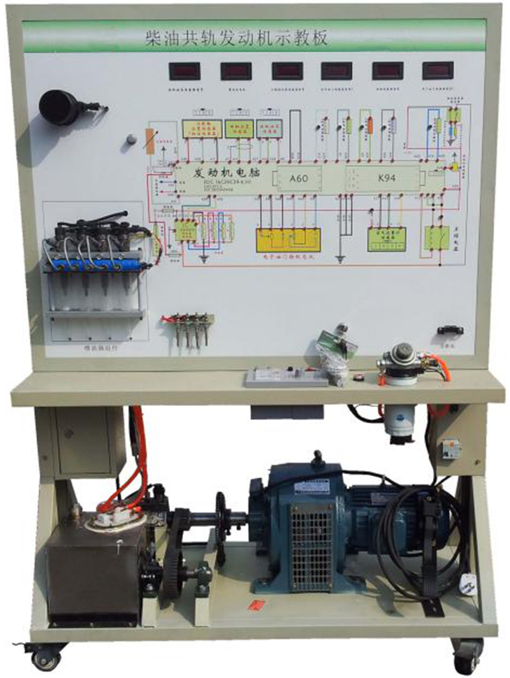 1.真實可運行的共軌柴油發(fā)動機燃油噴射系統(tǒng),充分展示燃油噴射系統(tǒng)的組成結(jié)構(gòu)和工作過程。電機驅(qū)動曲軸位置信號輪,可演示電子燃油噴射工作情況。