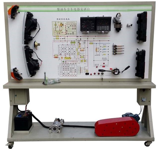 全車電路板試教板教學設備采用 全新東風牽引車EQ2102 柴油機整車電器實物為基礎,充分展示汽車儀表系統、燈光系統、雨刮系統、喇叭系統、發動機電器系統、起動系統和充電系統等汽車電器各系統的組成結構和工作過程。