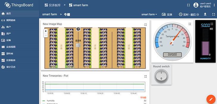 圖:智慧牧場課程案例,在牛棚內安裝溫濕度傳感器和排風扇,在ThingsBoard云平臺上制定規則策略,當棚內溫度過高時自動開啟排風扇對牛棚進行降溫,以保障奶牛養殖環境處在適宜的溫度下。
