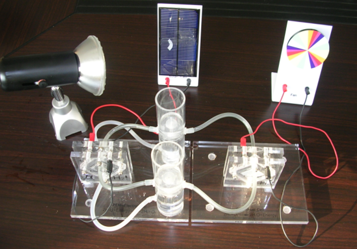 燃料電池教具是利用光線照射在太陽能電池板上產生電能,然后利用產生的電能作用在電解電池模塊上,使水發生電解產生氫氣和氧氣。氫氣和氧氣進入到發電模塊產生電能,帶動風扇轉動。