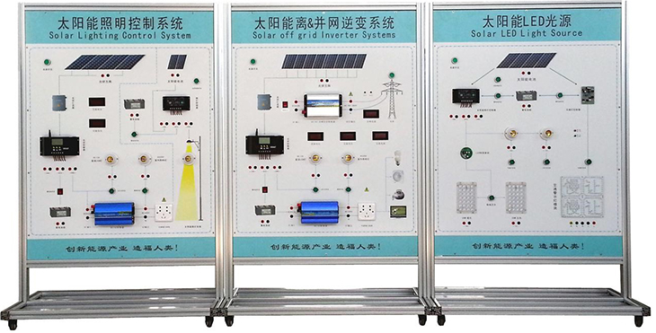 光伏發(fā)電系統(tǒng)集成演示版,主要由A、B、C三塊主模板組成。A 太陽(yáng)能照明控制系統(tǒng)演示模板、B 太陽(yáng)能離&并網(wǎng)逆變系統(tǒng)演示模板、C 太陽(yáng)能LED光源系統(tǒng)演示模板。