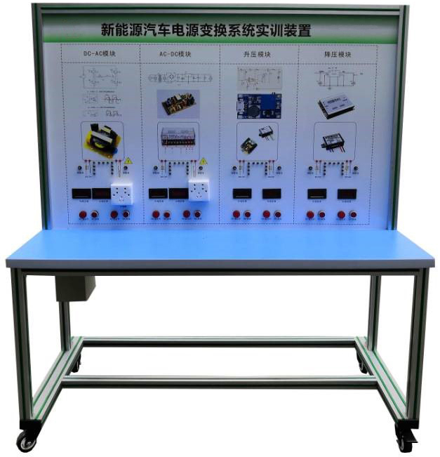 DC-AC模塊(12V220V)、點火開關、AC-DC模塊(220V12V)、升壓模塊(12V24V)、降壓模塊(24V12V)、發(fā)光二極管閃光燈燈條、指示燈、操作開關、接觸器、急停開關、一體化全鋁合金型材搭建的移動臺架(1500×700×1700mm 帶自鎖腳輪裝置,帶安裝檢測端子的原理面板,面板1448×940mm)、設備操作說明書。