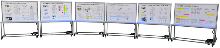 汽車檢測實訓臺面板采用 ≥ 4mm 厚耐腐蝕、耐創擊、耐污染、防火、防潮的高級鋁塑板,表面經特殊工藝噴涂底漆處理;面板打印有永不褪色的彩色電路圖;學員可直觀對照電路圖和原車實物,認識和分析各控制系統的工作原理。
