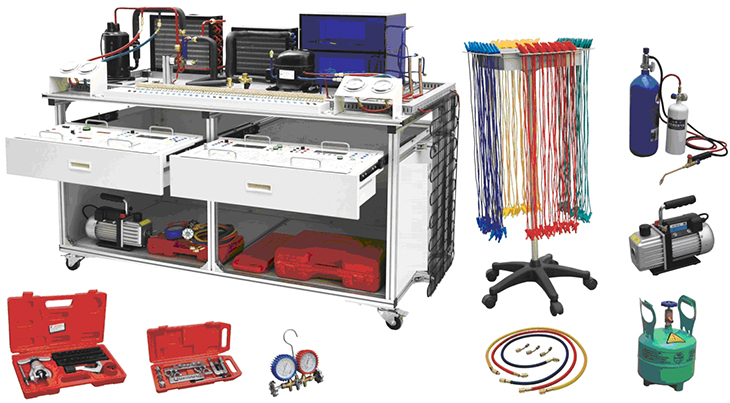 1、實訓臺采用鋁型材臺架加實訓模塊結構,裝置采用一體化設計,由導軌式鋁合金安裝平臺、空調系統、電冰箱系統、電氣控制系統等組成。底部安裝有四個帶剎車的腳輪,可以方便的移動和固定。設備配置空調制冷系統管路1套、直冷電冰箱制冷系統管路1套、安全插端子排,壓力表(1.5MPa)2只(3.5 MPa)2只等。