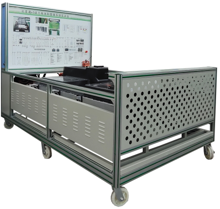 (比亞迪e5 EV300純電動汽車) 鋰動力電池組、電池管理系統BMS、BMS顯示屏(7寸觸摸屏)、維修開關、輔助蓄電池(12V45AH)、高壓配電箱、漏電傳感器、車載充電機、國標充電插座與充電槍、直流接觸器(包含充電繼電器、總正繼電器、總負繼電器、預充繼電器)、急停開關與電源總開關、一體化全鋁合金型材搭建的移動臺架(1500×700×1700mm ,帶自鎖腳輪裝置,帶安裝檢測端子的原理面板1448×940mm)、故障考核系統、設備操作說明書。