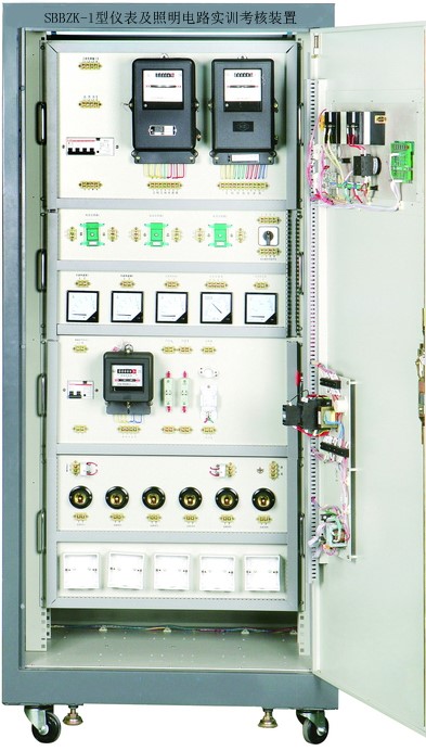 儀表及照明電路實訓考核設備是按照勞動和社會保障部頒發的"工人等級標準""職業技能鑒定"規范要求而設計的,它集培訓、理論、實際操作和考核鑒定為一體的多功能設備。該裝置采用實際應用的配電柜為主體,合理利用柜體的雙面空間,進行合理布局,配置可靠的元器件。它既可用于對電工儀表和照明電路的操作實訓。也可作為初、中、高級電工技能考核設備。